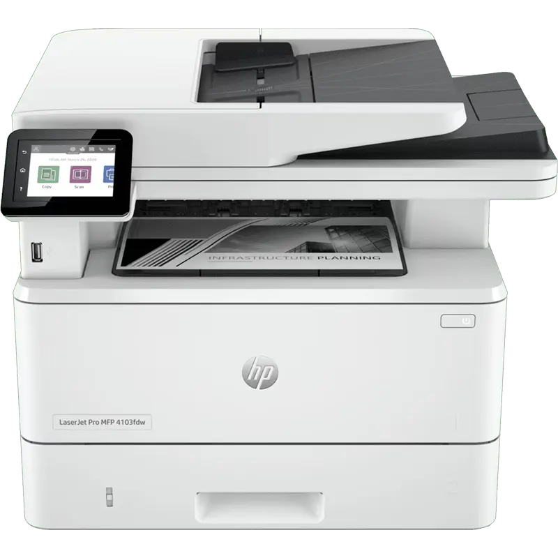 The HP LaserJet Pro MFP 4103fdw (2Z629A) is aย high-speed monochrome laser printer designed for small to medium workgroups, printing up to 40-42 ppm with automatic duplexing and a 50-sheet ADF. It features a 2.7-inch color touchscreen, Wi-Fi, Ethernet, and mobile printing (HP Smart, Apple AirPrint).ย